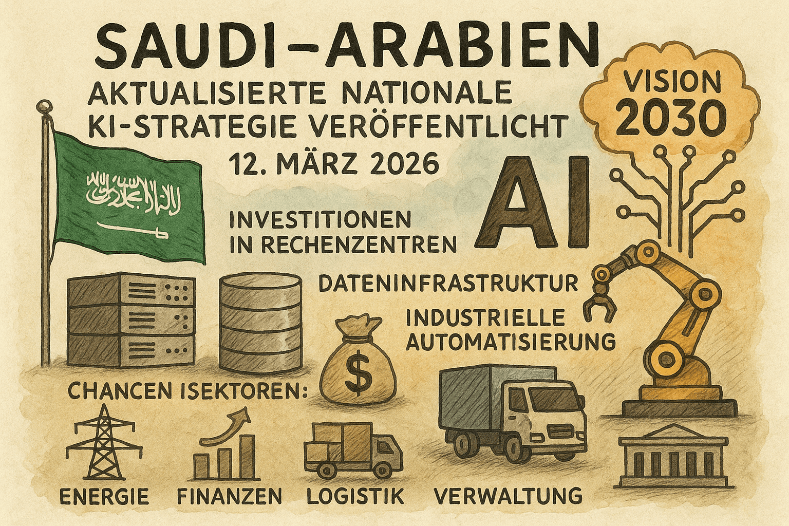 Mit der am 12. März 2026 veröffentlichten Aktualisierung der nationalen KI-Strategie hebt Saudi-Arabien Künstliche Intelligenz von einem Digitalthema auf die Ebene kritischer Infrastruktur. KI wird damit ähnlich wie Energie, Transport und Logistik als Grundpfeiler von Vision 2030 behandelt.