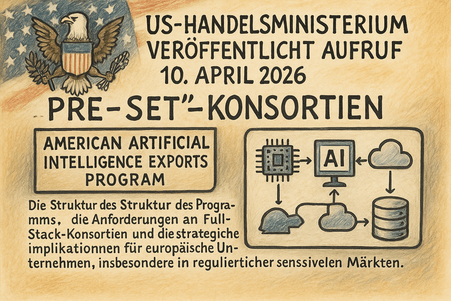 Das US-Handelsministerium hat am 10. April 2026 offiziell den Aufruf für industriegeführte „pre-set“ Konsortien im Rahmen des American Artificial Intelligence Exports Program veröffentlicht. Ziel ist es, vollständige, US-basierte KI‑Technologie-Stacks als Exportpakete zu bündeln und mit staatlicher Unterstützung weltweit zu vermarkten. Der Beitrag erklärt die Struktur des Programms, die Anforderungen an Full-Stack-Konsortien und die strategischen Implikationen für europäische Unternehmen, insbesondere in regulierten und geopolitisch sensiblen Märkten.