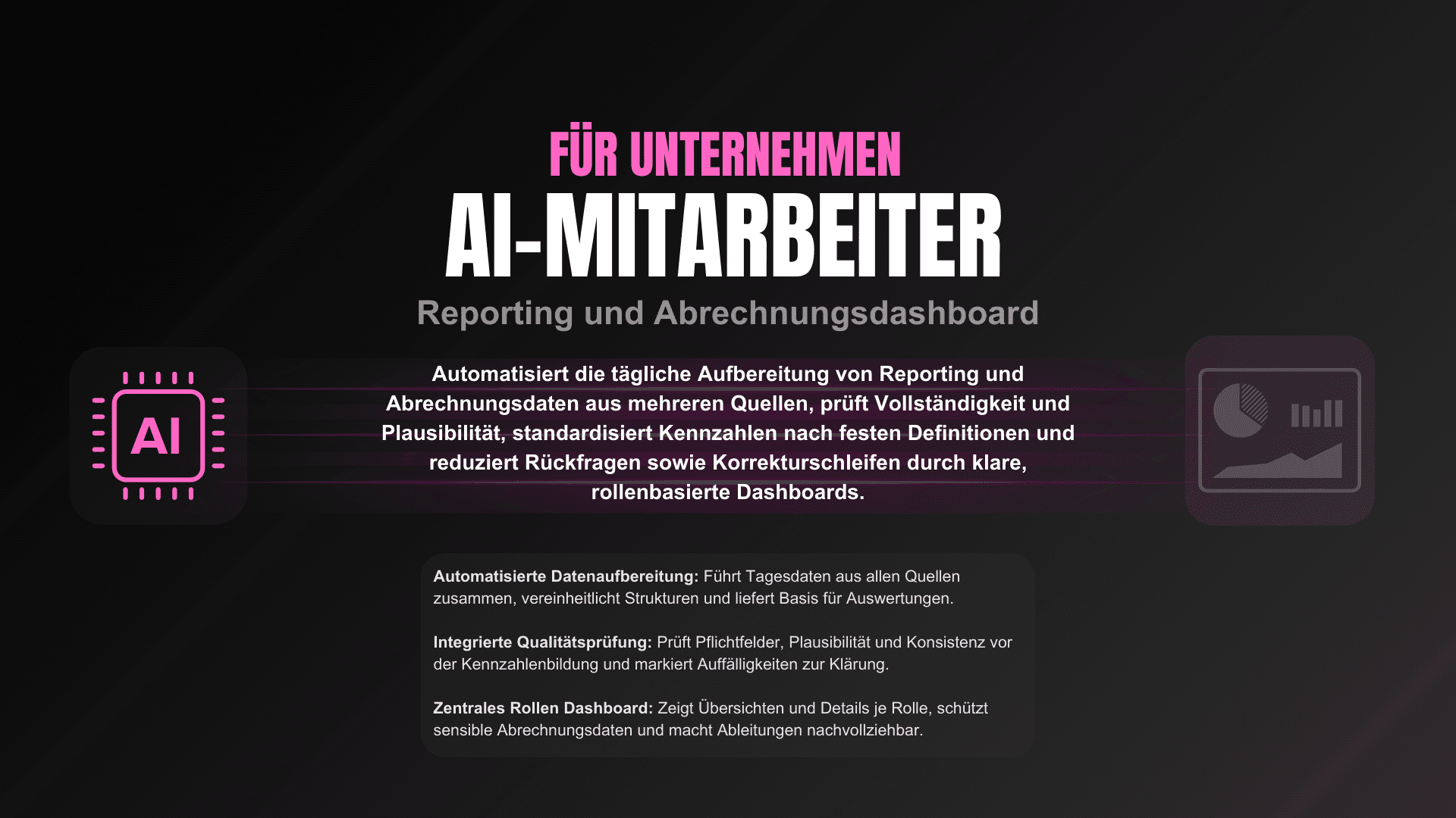 In diesem Projekt wurde ein zentrales Reporting- und Abrechnungsdashboard eingeführt, das durch KI-gestützte Prozessautomatisierung die tägliche Datenaufbereitung standardisiert. Ein AI-Mitarbeiter übernimmt dabei wiederkehrende Arbeitsschritte, die zuvor manuelle Übergaben, Prüfungen und Korrekturen erfordert haben.
